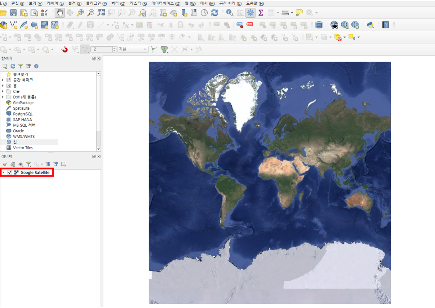 아래 이미지와 같이 위성사진이 지도 배경에 잘 적용되었다면, 배경지도 추가가 성공적으로 완료된 것입니다.