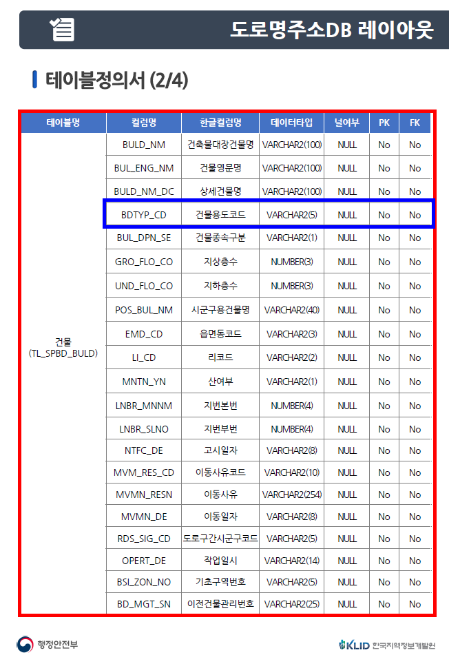 ‘도로명주소 전자지도’의 테이블 정의서에 따르면 BDTYP_CD 항목이 바로 건축물 용도 코드에 해당하며, 이를 통해 각 건축물을 용도별로 시각화할 수 있습니다.
