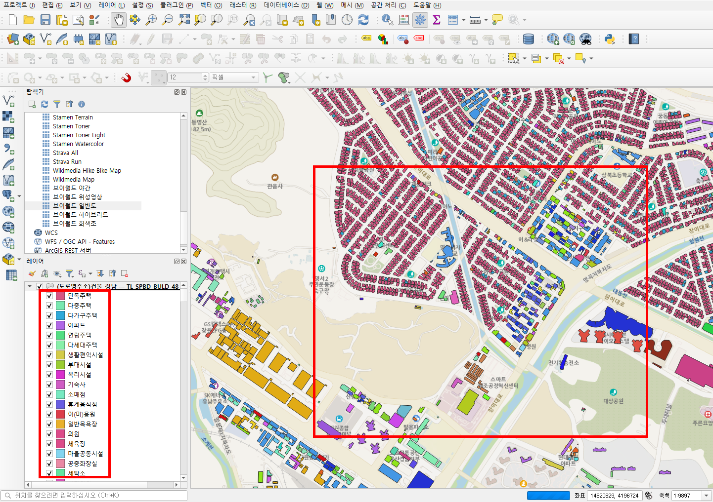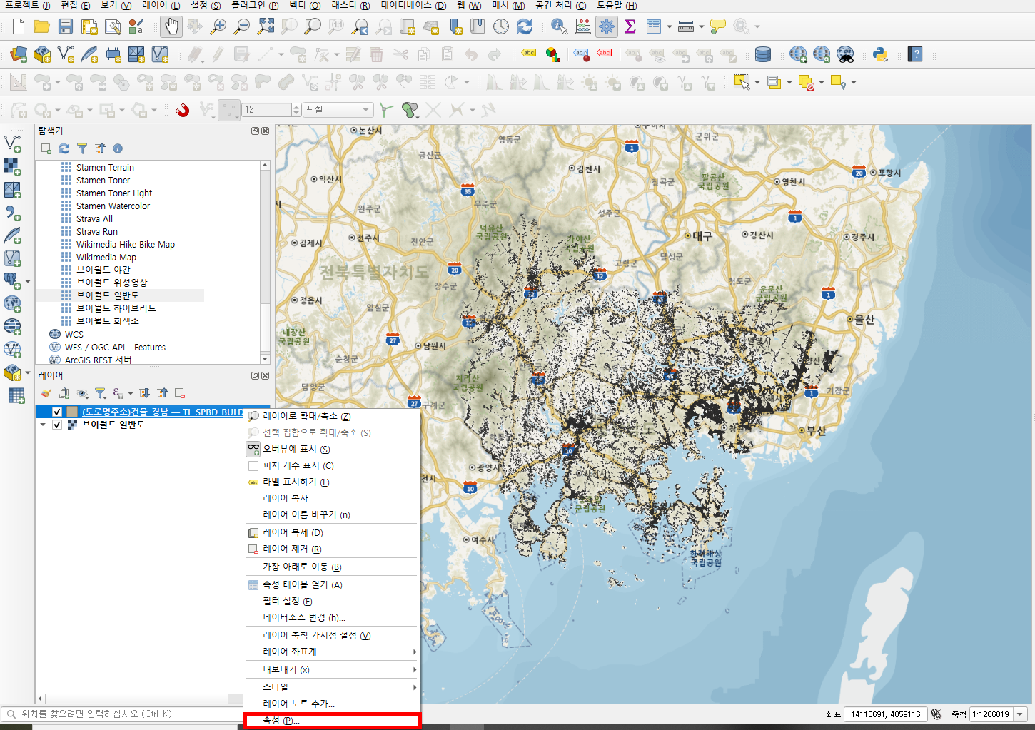 이제 QGIS에 불러온 건축물 데이터의 속성값을 활용해, 건축물을 용도별로 분류해보겠습니다.