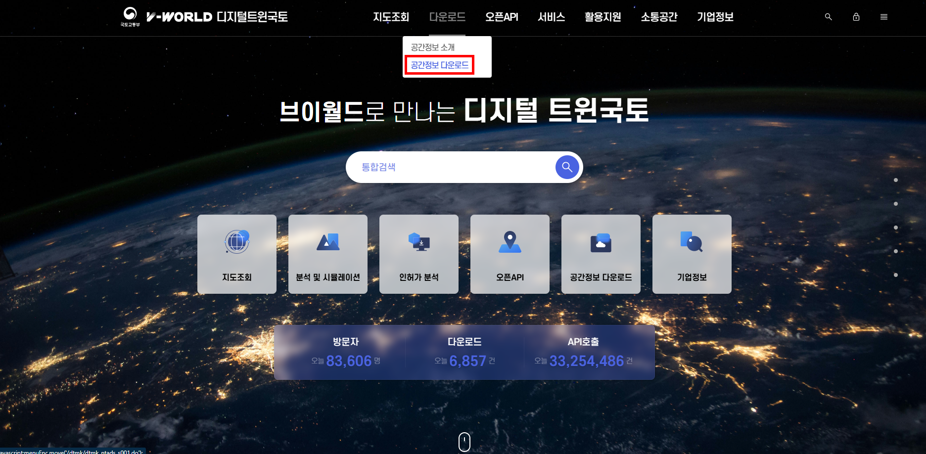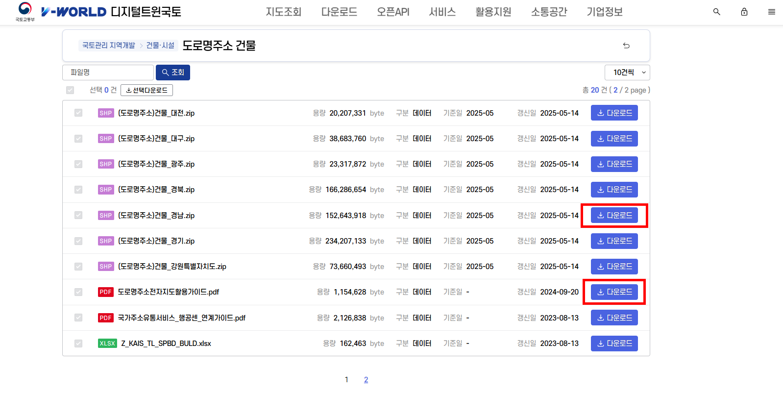 아래 예시 이미지를 참고하여, VWorld(브이월드)에서 제공하는 건축물 데이터와 활용가이드를 다운로드해주세요.