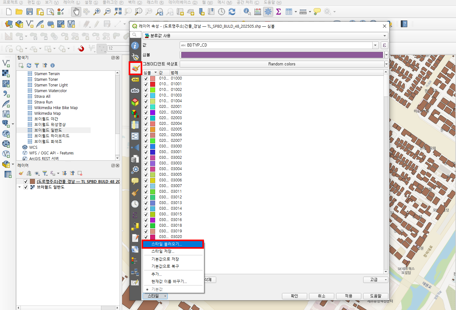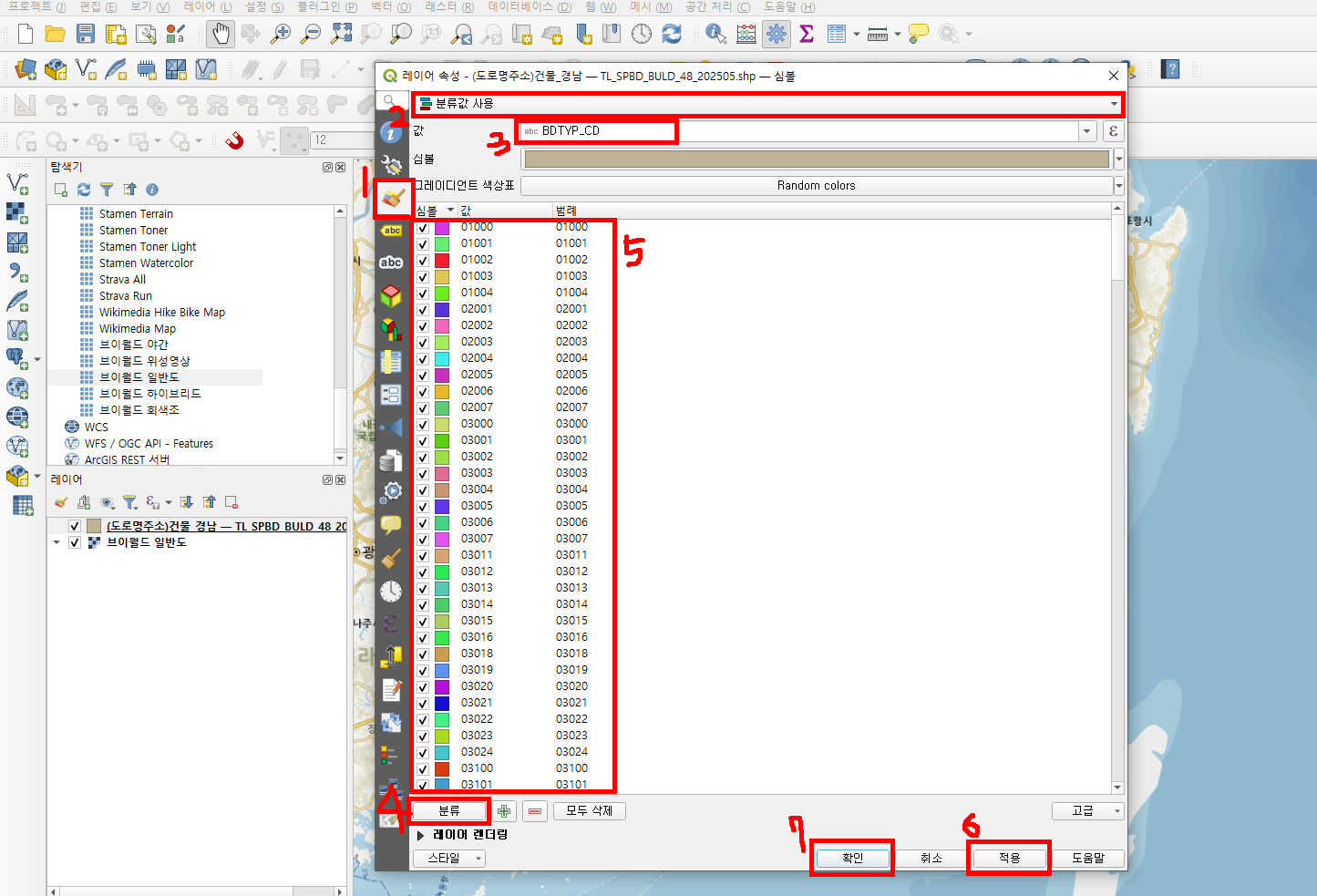 QGIS 상에서는 해당 레이어의 속성 창으로 이동한 뒤, ‘분류값 사용(Categorized)’ 스타일을 선택하여 BDTYP_CD 필드를 기준으로 벡터 레이어를 분류하면 됩니다.