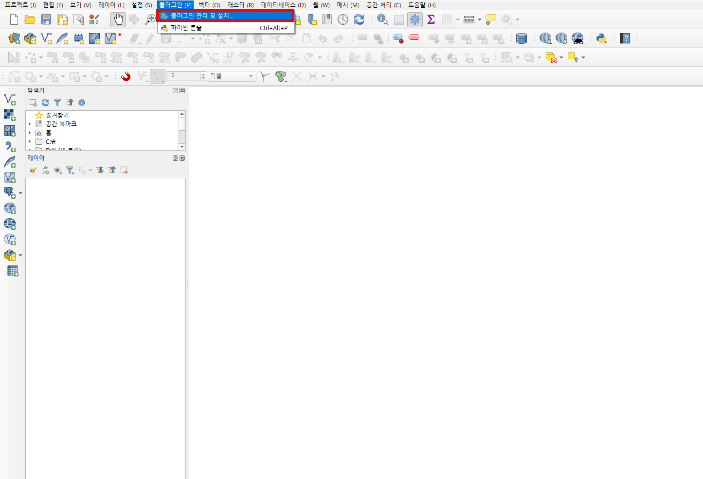 상단 메뉴바에서 플러그인 > 플러그인 관리 및 설치를 클릭합니다. 이 창에서는 다양한 QGIS 플러그인을 설치하거나 관리할 수 있습니다.
